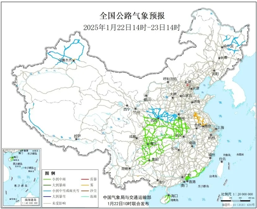 今天,全國大部地區降水稀少,新疆和西藏關注降雪可能造成的道路濕滑和積雪、結冰;江蘇、安徽、新疆關注局地大霧影響交通安全。23日起寒潮將影響我國大部,關注大範圍雨雪天氣對交通出行的不利影響。