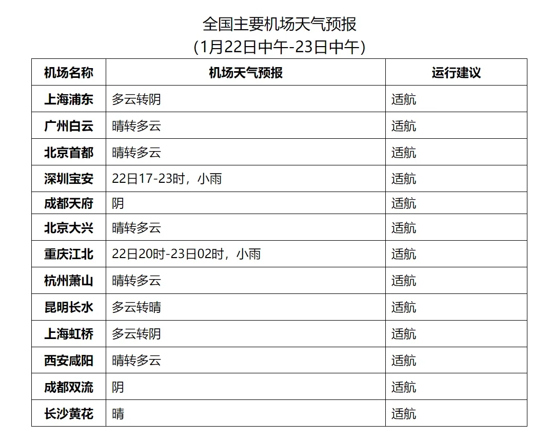 22日中午,哈爾濱、長春等機場有小雪;22日下午至夜間,烏魯木齊機場有霧,能見度800米;23日中午,烏魯木齊機場有小雪。
