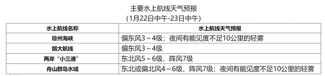 22日午後至夜間,台灣海峽、巴士海峽、南海北部和西南部海域將有5~7級、陣風8級的東北風。舟山群島附近海域、東海南部海域將有4~6級的東北風或偏北風。渤海海峽將有3~4級的偏東風。22日夜間,瓊州海峽、北部灣北部海域、雷州半島附近海域、東海西北部海域、杭州灣將有輕霧,能見度不足10公里。