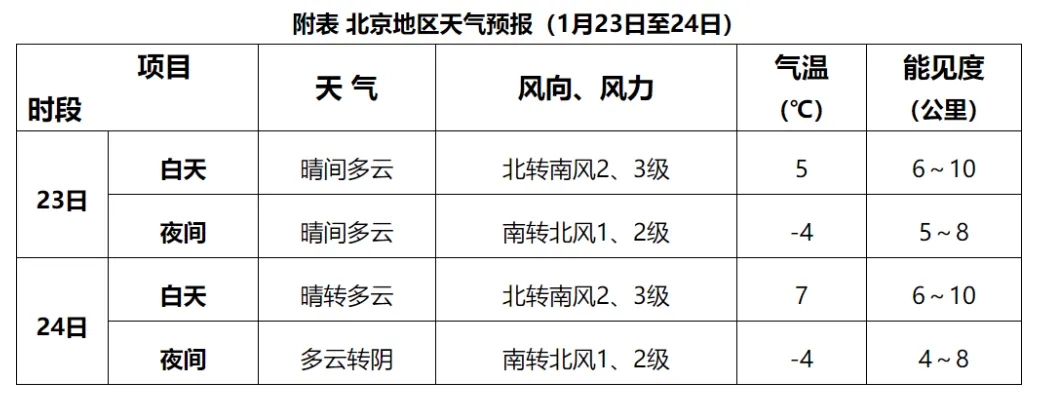 預計,23日至24日北京地區天氣為晴到多雲。期間大氣擴散條件及能見度轉差,夜間有輕霧;白天最高氣溫5~7℃,夜間最低氣溫-4℃左右(見附表)。