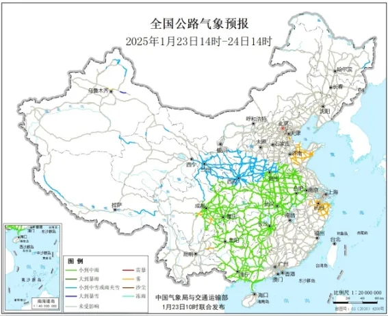 23日起寒潮和大範圍雨雪天氣將影響我國大部,公路交通受阻的氣象災害風險高,關注雨雪、大風、低能見度天氣對交通出行的不利影響。