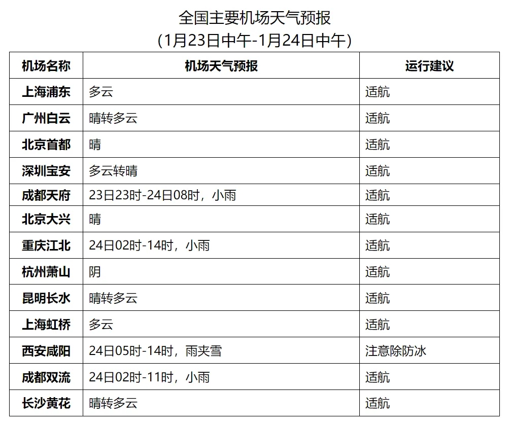23日中午至24日中午,烏魯木齊機場有小雪;24日早晨至中午,蘭州、銀川等機場有小雪,西安機場有小雨夾雪。