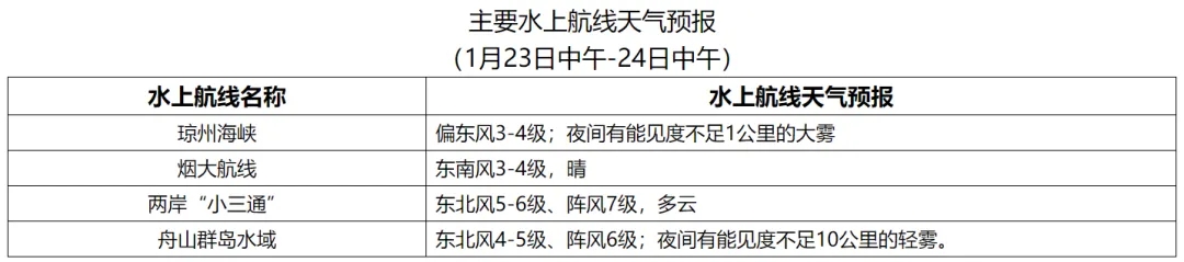 23日午後至夜間,東海南部、台灣海峽、巴士海峽、南海東北部有5~7級、陣風8級的東北風。23日夜間至24日早晨,瓊州海峽、北部 灣、廣東西部沿岸海域、上海沿岸海域、浙江沿岸海域有輕霧,其中瓊州海峽、廣東西部沿岸海域、北部灣北部海域有能見度不足1公里的大霧。