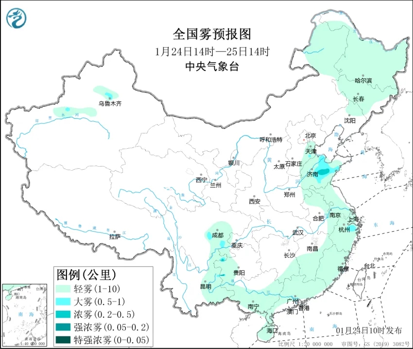 24日夜間至25日早晨時段,山東中部、浙江東部、四川盆地南部、新疆沿天山北坡等地的部分地區有大霧天氣,局地有能見度低於500米的濃霧(見圖1)。