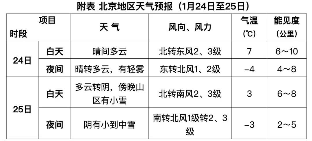 預計,24日北京地區天氣為晴到多雲,風力不大。受冷空氣影響,25日白天天氣轉陰,氣溫下降;傍晚山區有小雪,夜間有小到中雪。該期間大氣擴散條件及能見度較差,夜間有輕霧;白天最高氣溫7~3℃,夜間最低氣溫-3~-4℃(見附表)。