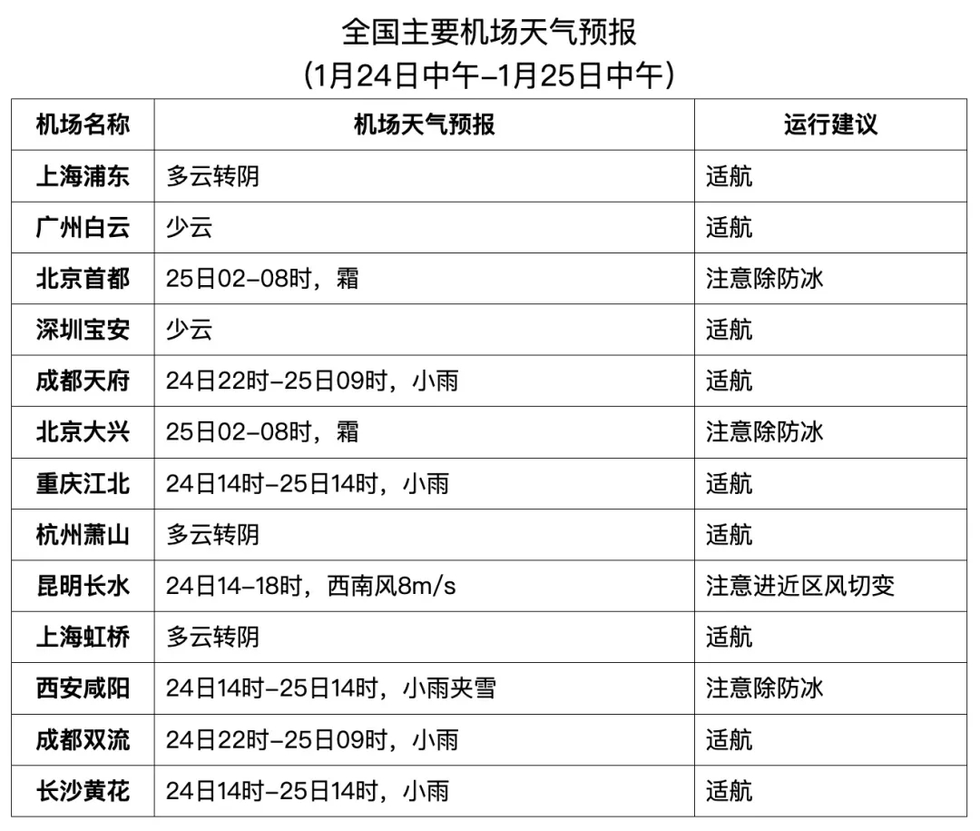 24日中午至25日早間,西寧、蘭州等機場有小雪,西安機場有小雨夾雪;24日夜間至25日早間,銀川機場有小雪;25日淩晨至早間,哈爾濱、長春、瀋陽、北京兩場、石家莊、天津、濟南、青島等機場有霜。