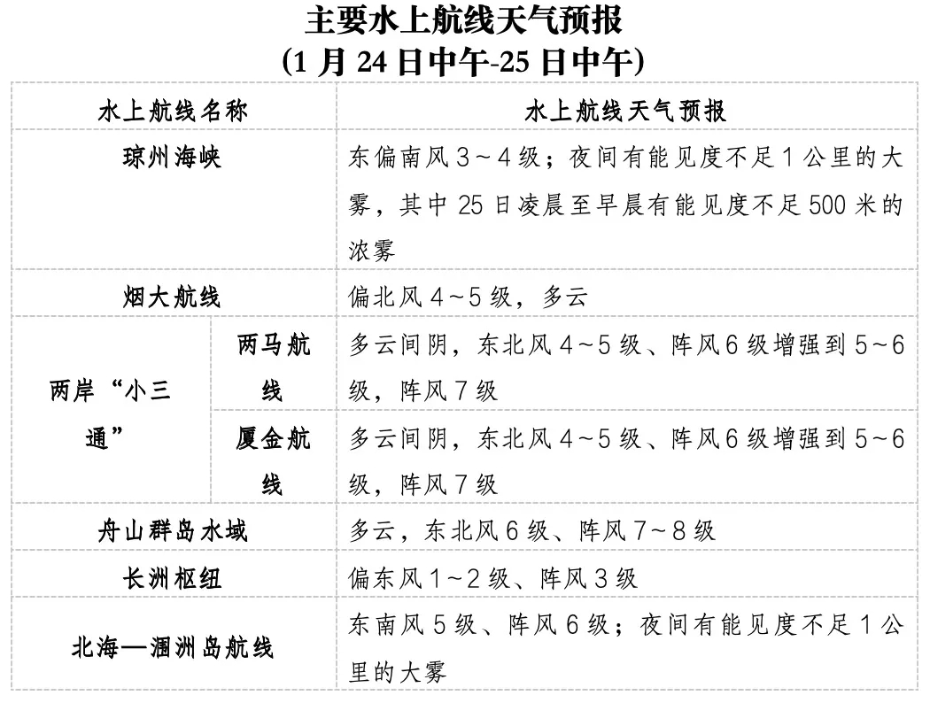 24日午後至夜間,東海大部、台灣海峽、南海東北部將有6~7級、陣風8級的東北風。24日夜間至25日上午,瓊州海峽、北部灣、雷州半島沿岸海域有大霧,能見度不足1公里,其中25日淩晨至早晨,瓊州海峽、雷州半島沿岸海域、廣西沿岸海域將有能見度不足500米的濃霧。