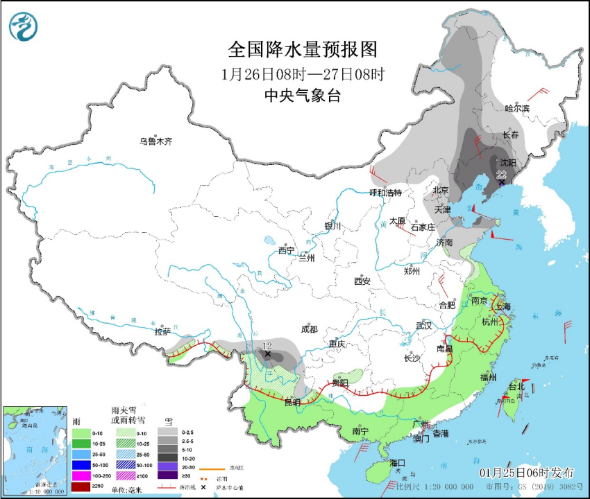 圖3 全國降水量預報圖(1月26日08時至27日08時)