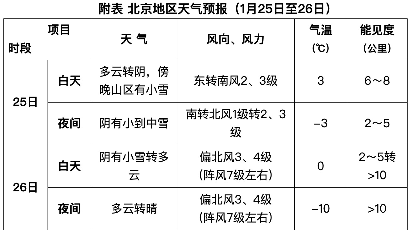 三、北京地區天氣預報預計25日白天,北京地區天氣轉陰,傍晚山區有小雪,夜間有小到中雪;26日白天降雪逐漸結束,夜間天氣轉晴;降雪期間能見度較差,夜間有輕霧。另外,受強冷空氣影響,26日白天至夜間有3、4級偏北風,陣風7級左右;氣溫大幅下降,白天最高氣溫3~0℃,夜間最低氣溫-3~-10℃。