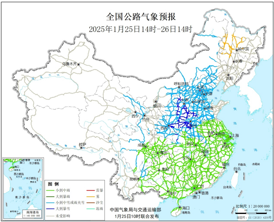 五、全國公路交通影響預報預計25日14時至26日14時,北京、天津、河北、河南、山東中西部、山西、內蒙古中東部、陜西、甘肅西部和東部、湖北西北部、安徽西部、四川西部、雲南北部、青海東部等地部分道路受降雪或雨夾雪影響,發生道路濕滑、結冰、積雪的風險較高;江淮、江漢、江南、華南、西南地區東部等地部分道路受降雨影響,發生道路濕滑的風險較高;黑龍江西南部、吉林西北部等地局地道路需防範低能見度對交通出行的影響(見圖4)。