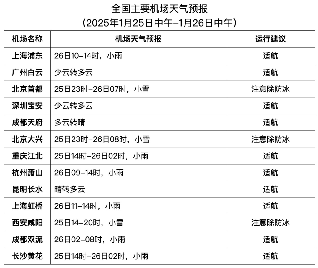 25日中午至26日中午,西安、太原、呼和浩特、鄭州、石家莊、北京兩場、天津、濟南等機場自西向東有一次小雪過程;25日夜間至26日早間,烏魯木齊機場有300-500米凍霧。