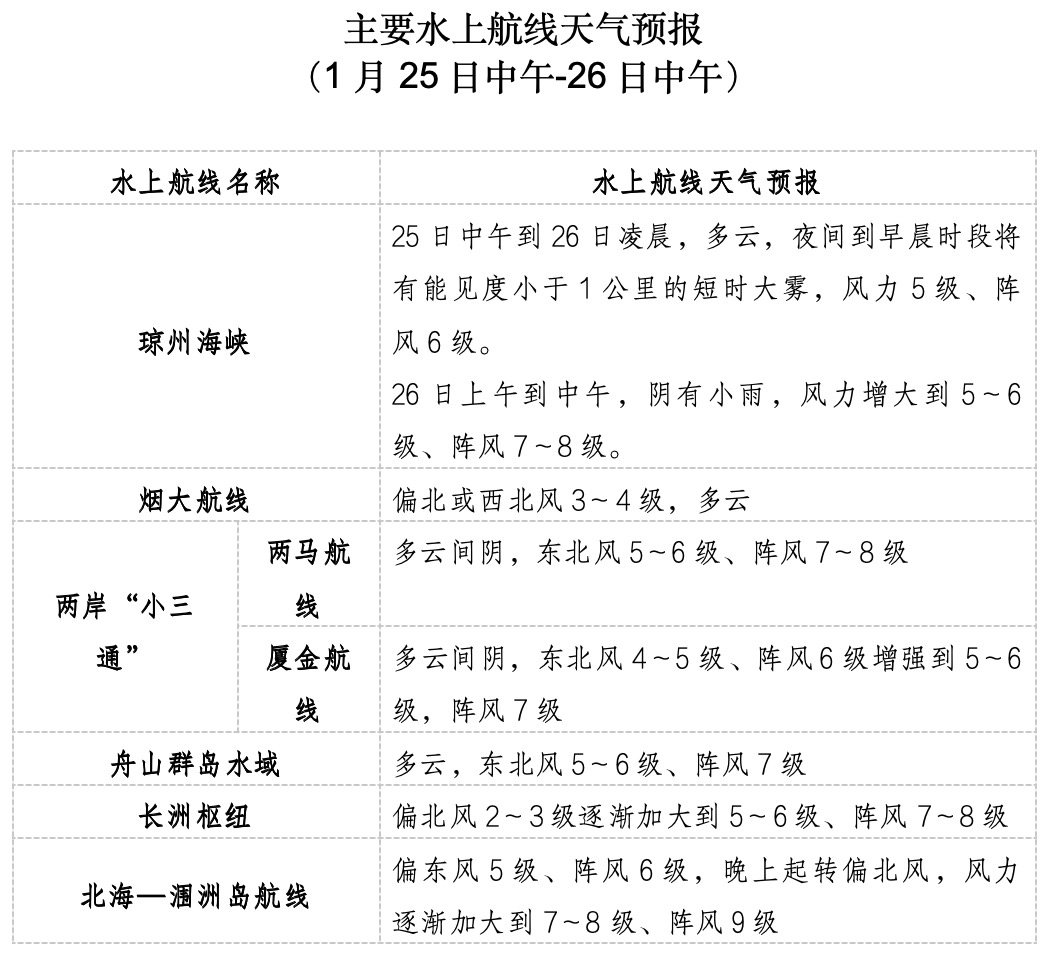 四、海上天氣預報預計25日午後至夜間,東海大部海域、台灣海峽、南海東北部海域、北部灣將有5級、陣風6級增大到6~7級、陣風8級的東北風。25日夜間至26日早晨,瓊州海峽部分時段將有能見度小于1公里的短時大霧。26日白天至夜間,渤海、渤海海峽、黃海中部和南部海域、東海大部海域、台灣海峽、台灣以東洋面、南海大部海域、北部灣將有7~8級、陣風9級的大風,其中渤海東部和黃海中部部分海域風力可達9級、陣風10級。瓊州海峽將有5~6級、陣風7~8級的東北風。
