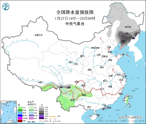 圖1 全國降水量預報圖(1月27日14時至28日08時)