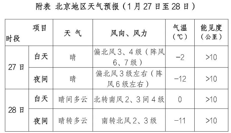 未來兩天北京地區天氣以晴為主。27日有3、4級偏北風,陣風6、7級。該期間白天最高氣溫-2~0℃,夜間最低氣溫-12~-11℃。具體天氣預報見附表。