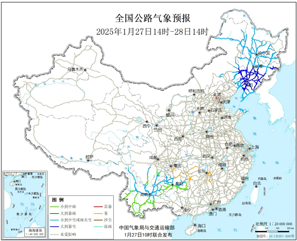 圖3 全國公路氣象預報圖(1月27日14時至28日14時)