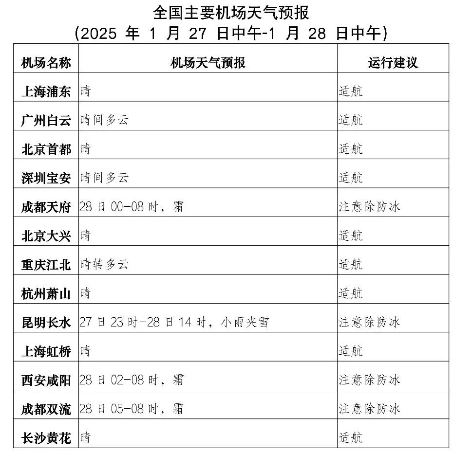 27日中午至28日中午,甘肅、寧夏、陜西、山西、河南、山東、湖北東部、安徽、江蘇、上海、浙江等地的中低空空域有中度顛簸;內蒙古東部、黑龍江、吉林、遼寧、山東半島等地的低空空域有積冰條件。