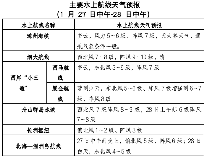 1月27日午後至夜間,渤海、渤海海峽、黃海大部、東海大部、台灣海峽、台灣以東洋面、巴士海峽、南海大部、北部灣將有7~8級、陣風9~10級的大風,其中黃海北部和中部、台灣以東洋面、巴士海峽的部分海域風力可達9級、陣風10~11級。