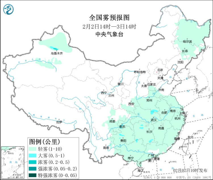 2日至3日冷空氣影響中東部地區。大部氣溫下降4~6℃,西北地區東南部、華北北部、東北地區、江南東部、華南等地部分地區下降6~8℃;北方地區伴有4~5級風,陣風7~8級;東部和南部海域有6~8級、陣風9級大風。江南、華南等地仍有小雨,甘肅、黑龍江等地的部分地區有小到中雪。預計2日夜間至3日上午,新疆天山北部、重慶西部、湖北北部、湖南北部等地的部分地區有大霧(見圖1)。