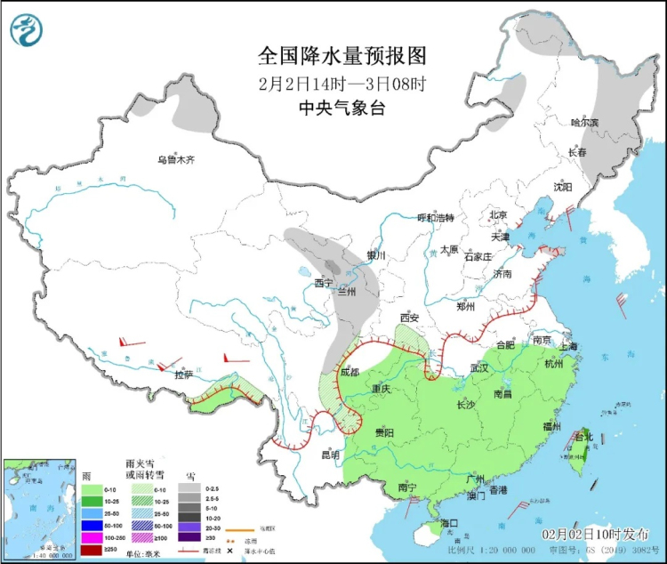 圖2全國降水量預報圖(2月2日14時-3日08時)
