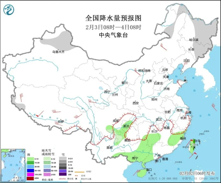 圖3全國降水量預報圖(2月3日08時-4日08時)