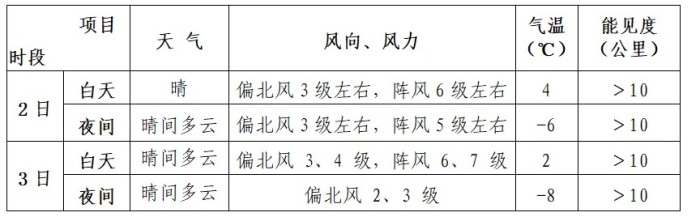 預計,未來兩天北京地區天氣以晴為主,風力較大,能見度轉好。受冷空氣影響,2日有3級左右偏北風,陣風5~6級;3日白天有3~4級偏北風,陣風6~7級。期間白天最高氣溫2~4℃,夜間最低氣溫-8~-6℃。具體天氣預報見附表。