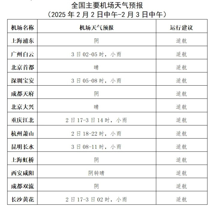 2日中午至3日中午,哈爾濱、長春、蘭州等機場有小雪;3日淩晨至早間,烏魯木齊機場預計有300~500米的凍霧;雷州半島、海南東部地區將受海霧低雲的影響,其中,海口機場預計有90米高的低雲。