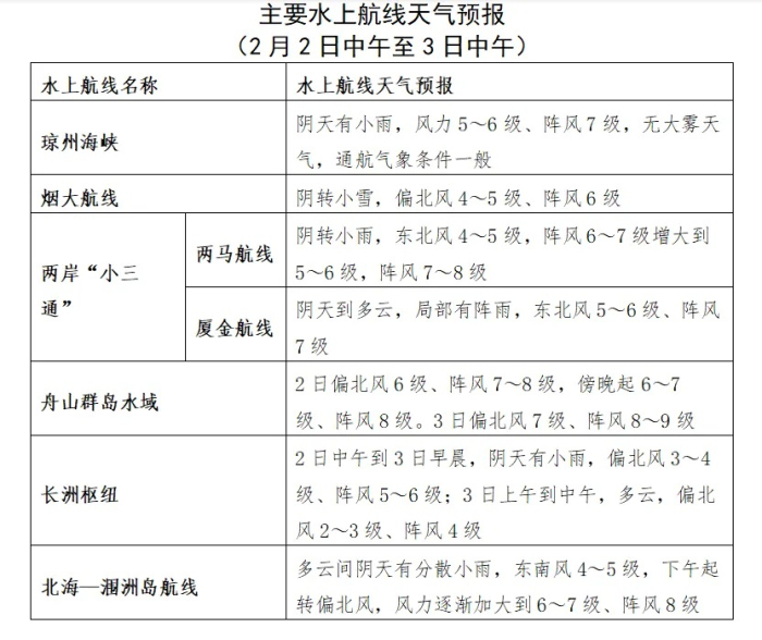預計2日中午至3日中午,瓊州海峽,陰天有小雨,風力5~6級、陣風7級,無大霧天氣,通航氣象條件一般。