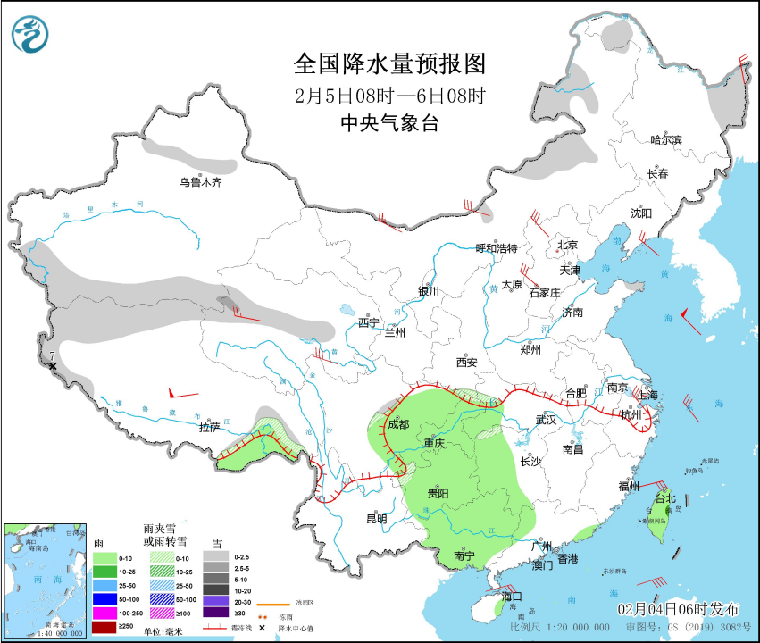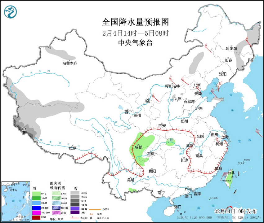 圖1 全國降水量預報圖(2月4日14時-5日08時)