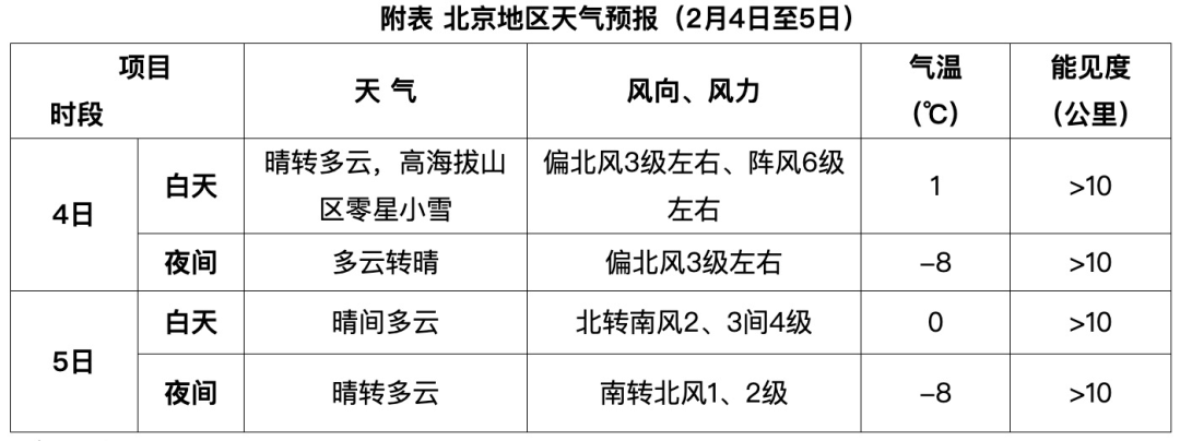 4日北京地區天氣以晴到多雲為主,下午高海拔山區有零星小雪;白天有3級左右偏北風,陣風6級左右,西部地區大風相對明顯;夜間風力有所減弱;白天最高氣溫1℃,夜間最低氣溫-8℃。