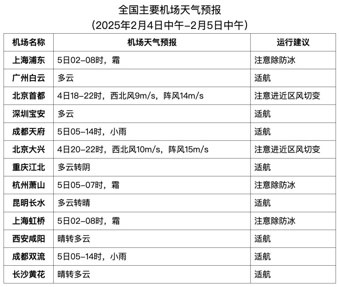 4日下午至夜間,首都、大興、太原等機場有6至7級陣風;5日淩晨至早間,合肥、南京、上海兩場、杭州等機場有霜;5日中午,太原、青島等機場有6至7級陣風。