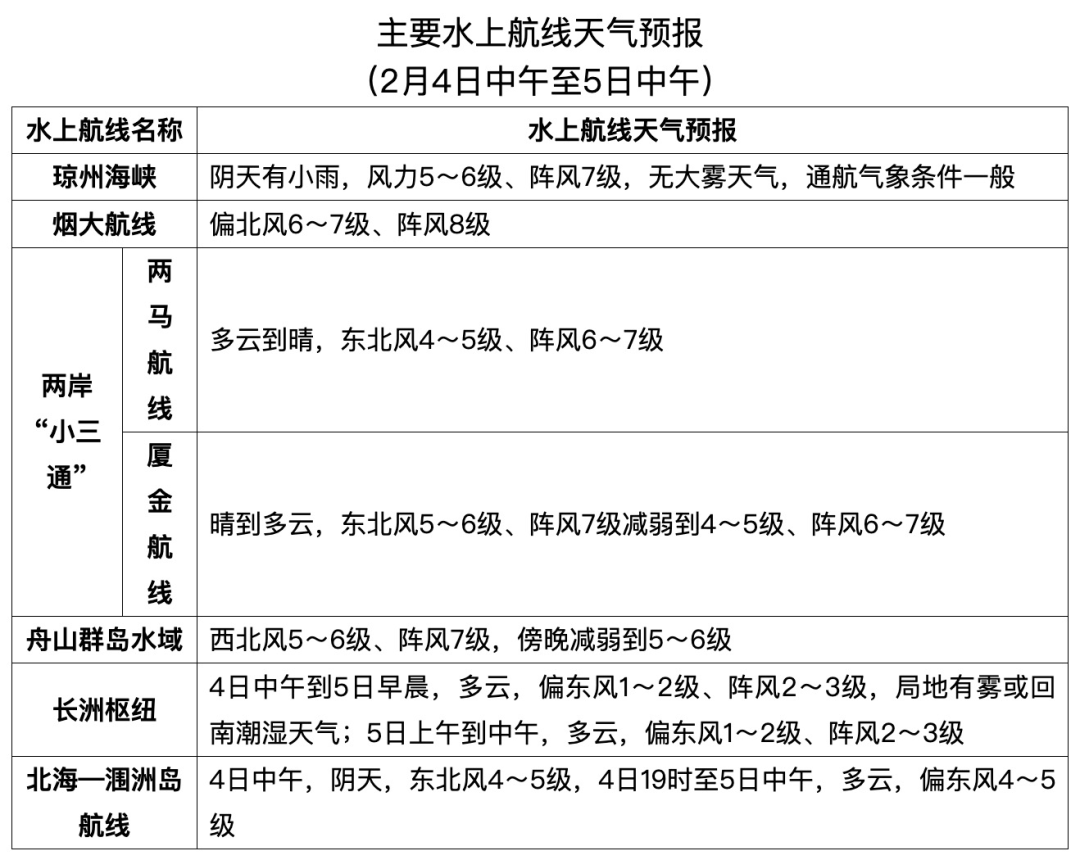 4日午後至夜間,渤海、渤海海峽、黃海大部海域、東海大部海域、台灣海峽、台灣以東洋面、巴士海峽、南海大部海域將有6~8級、陣風9~10級的偏北或東北風,其中台灣海峽、巴士海峽的部分海域風力可達9級、陣風10級。