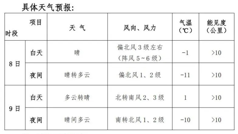8日北京天氣以晴為主,能見度好;白天有3級左右偏北風,陣風5~6級;低溫天氣持續,白天最高氣溫為-1℃,夜間最低氣溫-11℃。9日天氣為多雲轉晴,風力不大,氣溫回升,白天最高氣溫1℃,夜間最低氣溫-10℃。