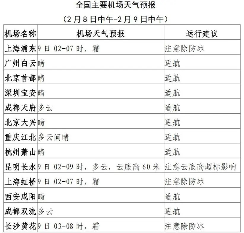9日淩晨至早間,烏魯木齊機場有500米凍霧,哈爾濱、長春、瀋陽、上海兩場、長沙等機場有霜。