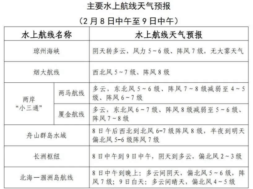8日午後至夜間,黃海大部、東海大部、台灣海峽、台灣以東洋面、巴士海峽、南海大部、北部灣將有6~8級、陣風9~10級的偏北到東北風,其中台灣海峽、巴士海峽、南海東北部和中東部、南海西南部的部分海域風力可達9級、陣風10~11級。