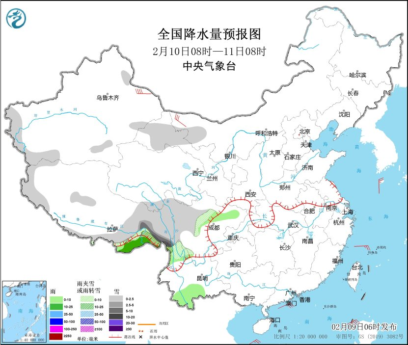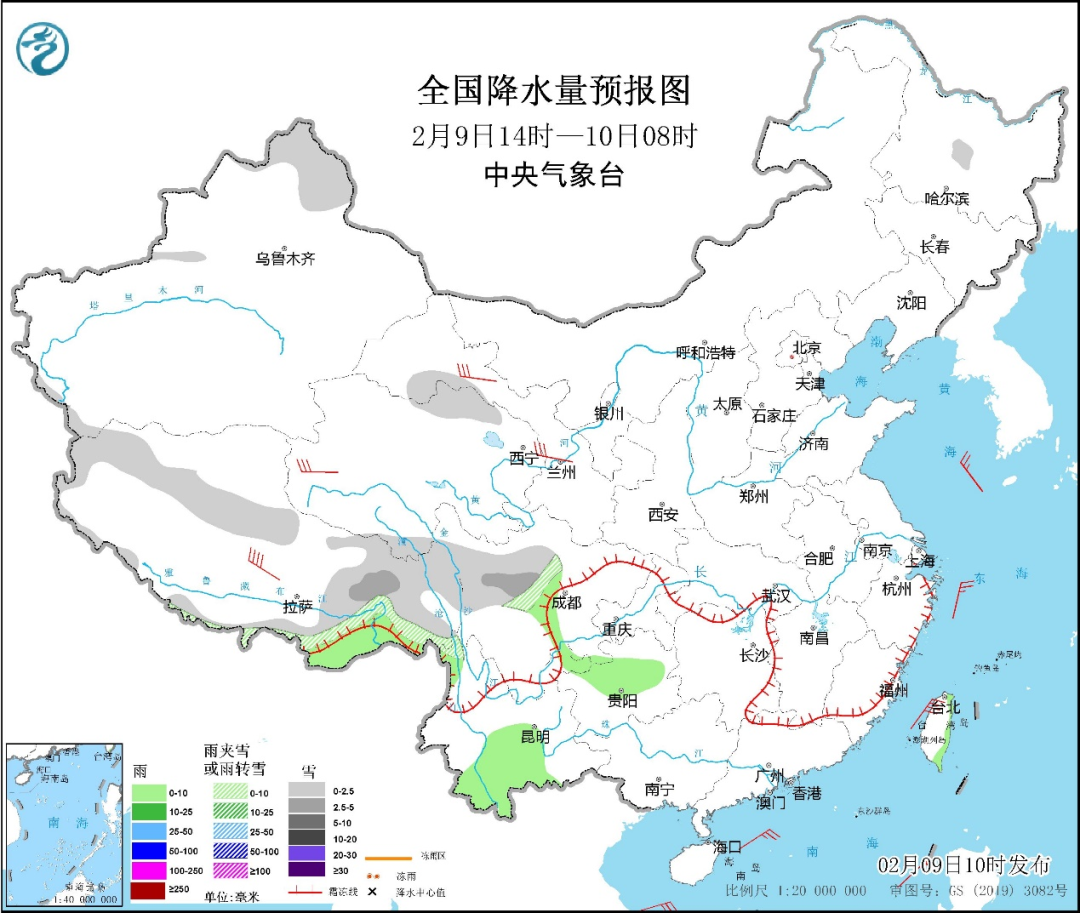 圖1 全國降水量預報圖(2月9日14時-10日08時)