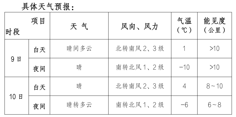 9日北京以晴為主,風力不大,能見度好;白天最高氣溫1℃,夜間最低氣溫-10℃。10日天空雲量有所增多,風力不大,能見度略有轉差;氣溫回升,白天最高氣溫4℃,夜間最低氣溫-6℃。