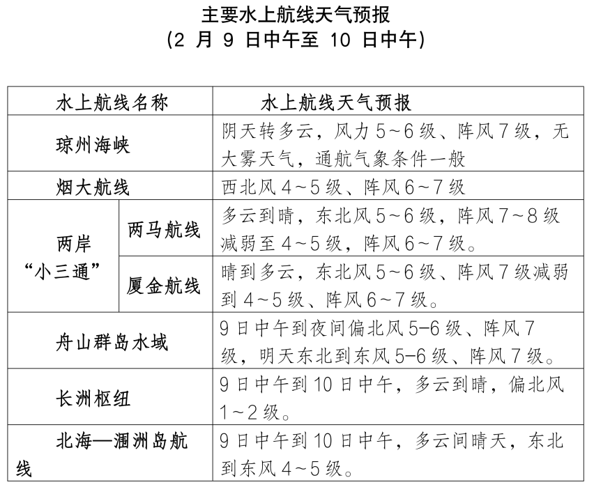 9日中午到10日中午,瓊州海峽陰天轉多雲,風力5~6級、陣風7級,無大霧天氣。