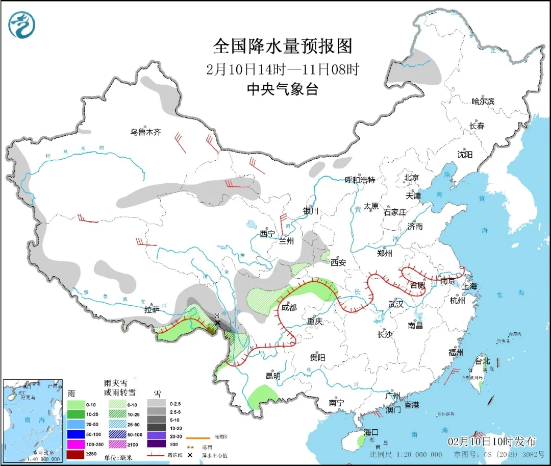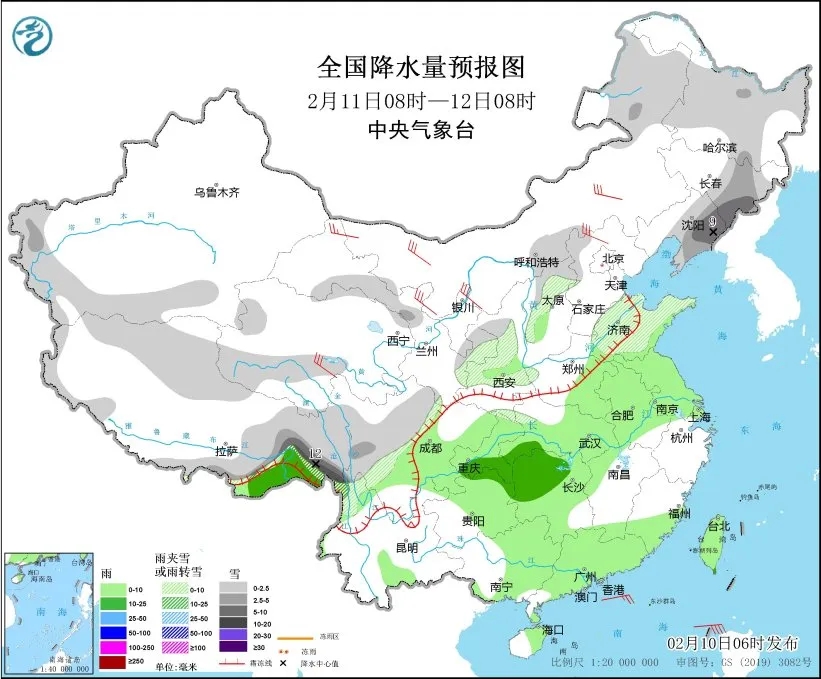 圖1 全國降水量預報圖(2月10日14時-11日08時)