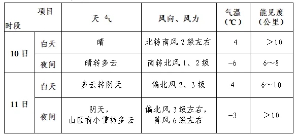 10日北京天氣為晴到多雲,風力不大;11日雲量增多,傍晚至前半夜山區有小雪,能見度略有轉差。受冷空氣影響,11日夜間偏北風逐漸增大至3級左右,陣風6級左右,能見度轉好。期間白天最高氣溫4℃,夜間最低氣溫-6~-3℃。具體預報見附表: