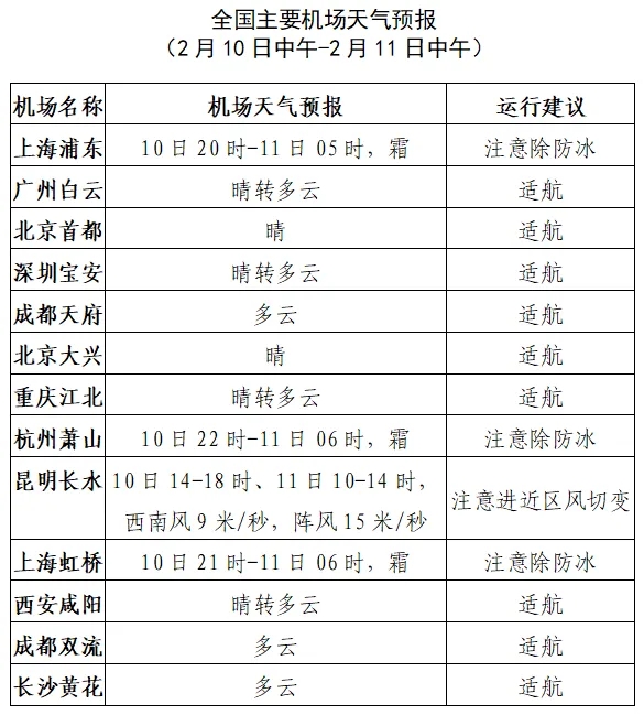 10日中午至11日中午,內蒙古、山西北部、河北、北京、天津、山東、遼寧、吉林、黑龍江、雲南、貴州、湖南等地的中低空空域有輕度顛簸;新疆西北部、內蒙古東北部、黑龍江、吉林等地的低空空域有積冰條件。
