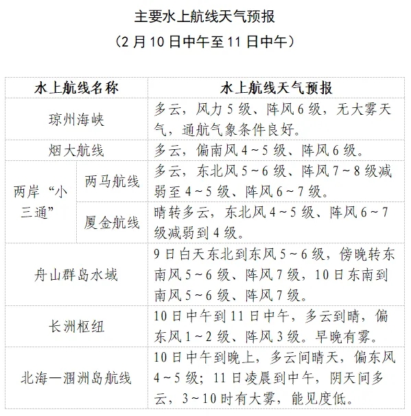 10日中午到11日中午,瓊州海峽多雲,風力5級、陣風6級,無大霧天氣,通航氣象條件良好。