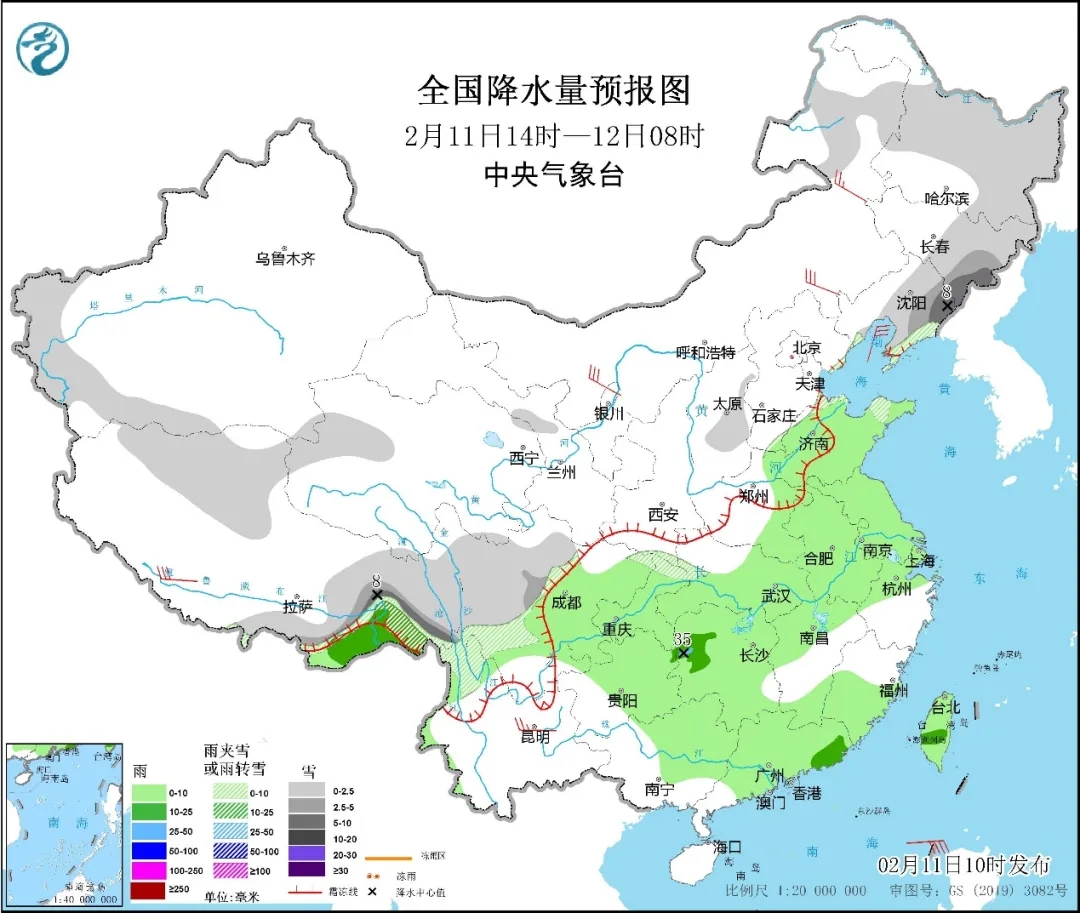 2月11日14時至12日08時,內蒙古東北部、黑龍江、吉林中東部、遼寧中東部、新疆西南部山區、西藏南部和東部、川西高原等地有小到中雪或雨夾雪,吉林東南部、遼寧東部、西藏東南部等地部分地區有大雪(5~8毫米)。西藏東南部、黃淮東部、江淮、江漢大部、江南北部和西部、西南地區東部、華南北部和東部等地有小到中雨,湖南西部局地有大雨(25~35毫米)。內蒙古、遼東半島、山東半島等地部分地區有4~6級風(見圖1)。