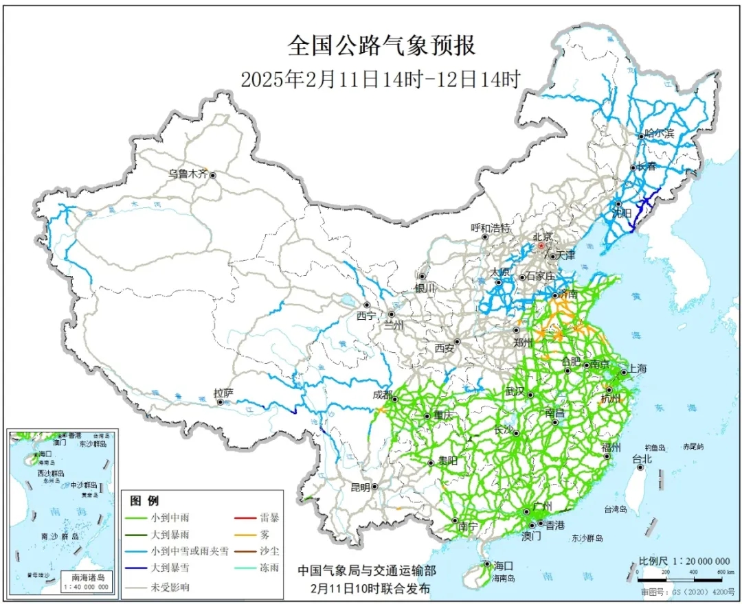 圖3 全國公路氣象預報圖(2月11日14時至12日14時)