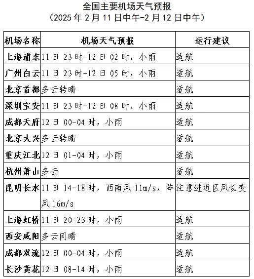 11日中午至12日中午,內蒙古、山西北部、河北、北京、天津、山東、遼寧、吉林、雲南、貴州、湖南等地的中低空空域有輕度顛簸;新疆西北部、內蒙古東北部、黑龍江、吉林等地的低空空域有積冰條件。