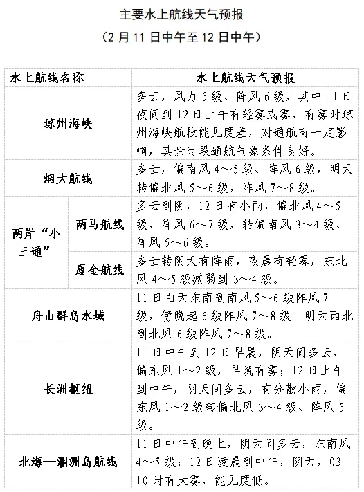 11日中午到12日中午,瓊州海峽多雲,風力5級、陣風6級,其中11日夜間到12日上午有輕霧或霧,有霧時瓊州海峽航段能見度差,對通航有一定影響,其餘時段通航氣象條件良好。