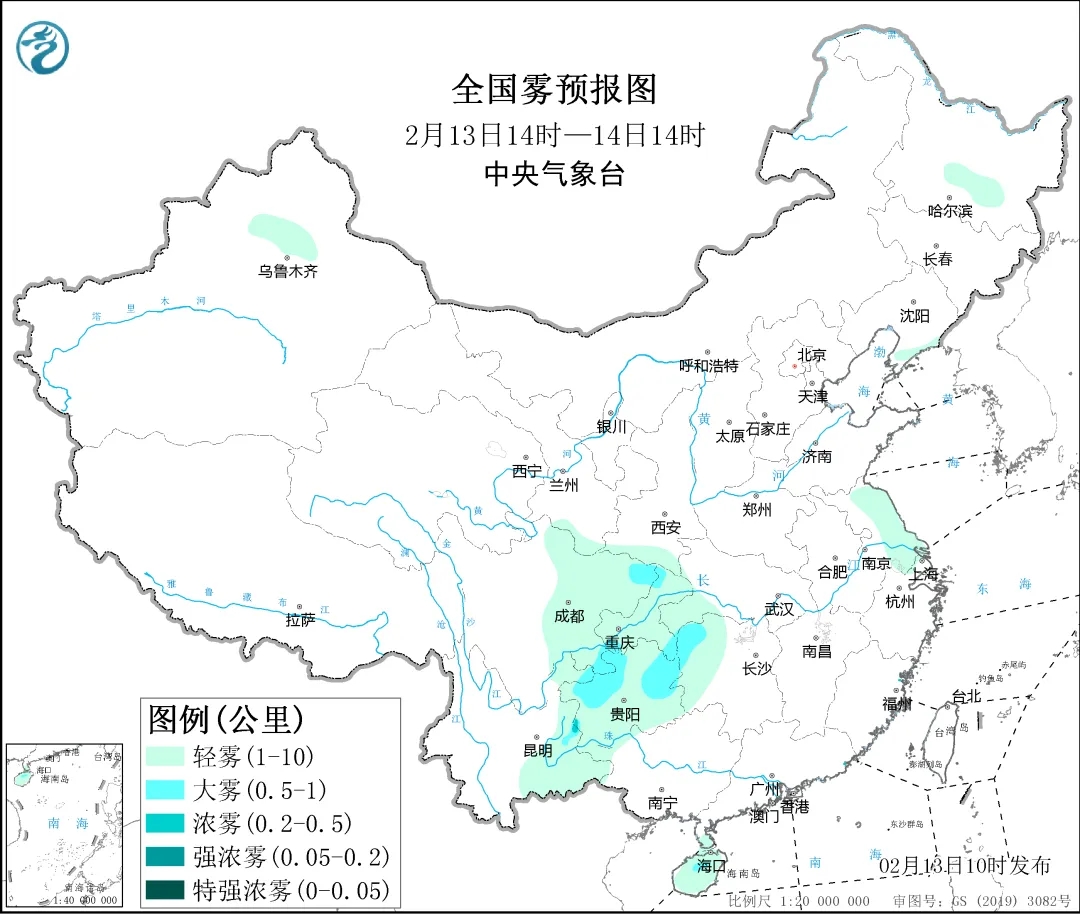 圖1 全國霧預報圖(2月13日14時-14日08時)