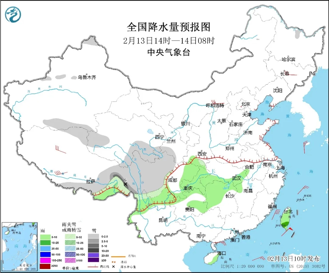 圖2 全國降水量預報圖(2月13日14時-14日08時)