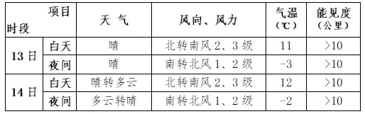 預計,13日至14日北京天氣晴到多雲,風力不大。該期間氣溫回升,白天最高氣溫11~12℃,夜間最低氣溫-3~-2℃。具體天氣預報: