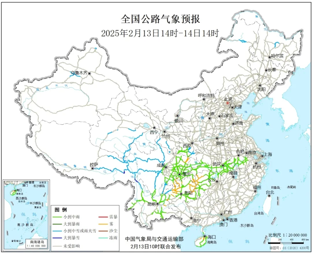 圖4 全國公路氣象預報圖(2月13日14時至14日14時)