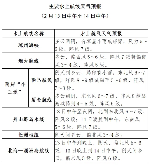 預計13日中午到14日中午,瓊州海峽,多雲間陰天有零星小雨或輕霧,風力5~6級、陣風7級,有霧時瓊州海峽航段能見度差,對通航有一定影響,其餘時段通航氣象條件一般。